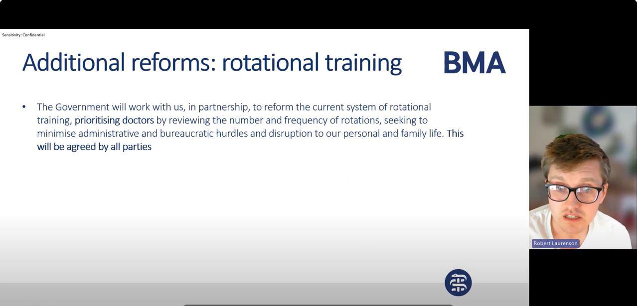 As part of the work to develop a ten-year Health Plan, DHSC will lead work in partnership with the BMA Resident Doctor Committee, NHS England, devolved administrations, the Medical Royal Colleges, the GMC and employers to reform the current system of training and rotational placements. This will be agreed by all parties.