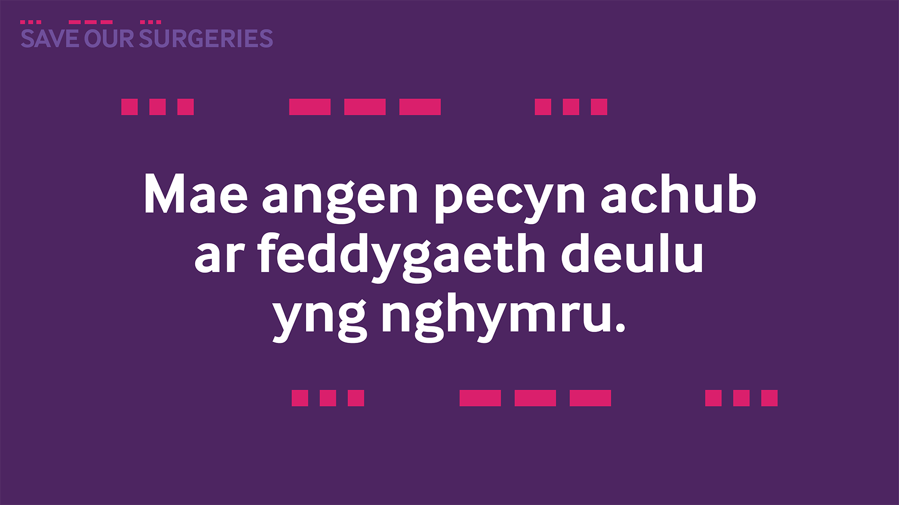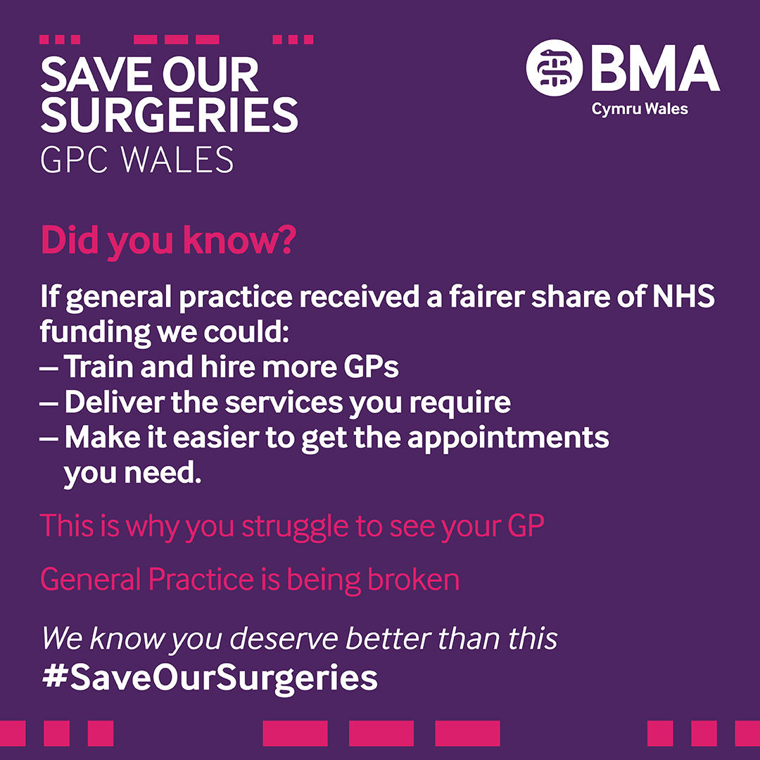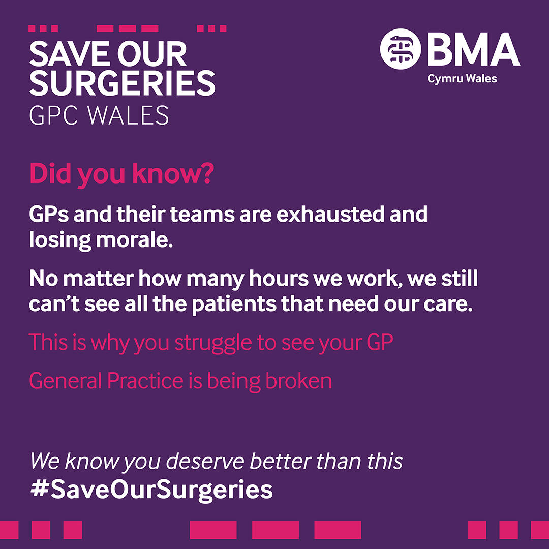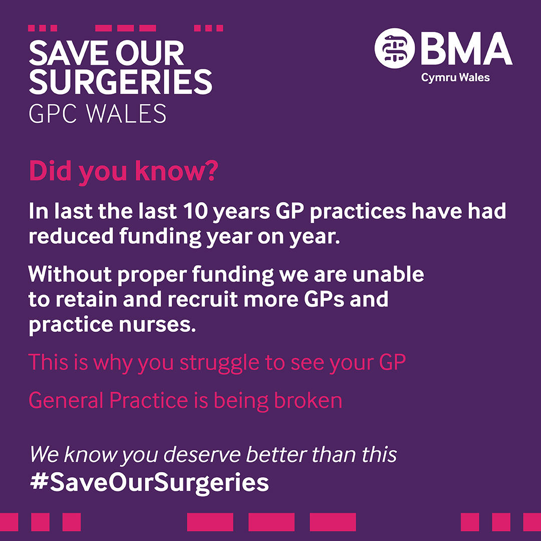 Our Save Our Surgeries campaign asks Welsh Government to commit to a rescue package for General Practice, to provide GPs and their patients with the support they need.